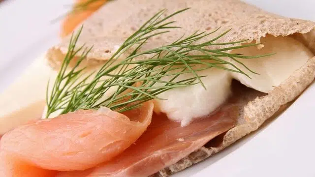 Crêpe au sarrasin (galette bretonne), chèvre et saumon fumé