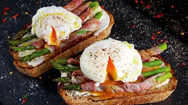 Toast met asperge-baconrolletjes en een gepocheerd eitje
