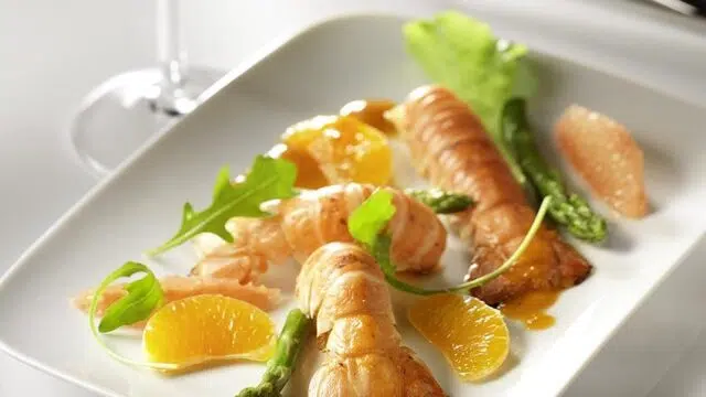 Geroosterde langoustines, citrusvruchten en groene asperges