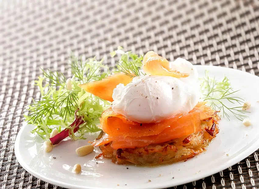 6. Neem de aardappelwafeltjes uit de oven, leg plakjes gerookte zalm in het midden van elk wafeltje, en leg daarop een goed uitgelekt ei.