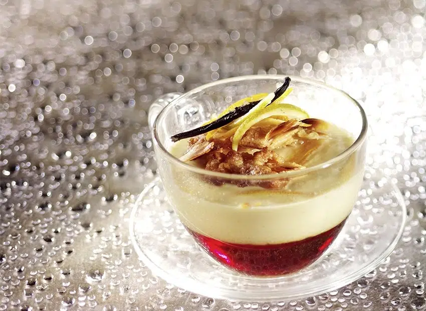 Maak een karamel met 100 g suiker. Verdeel deze over 6 schaaltjes.