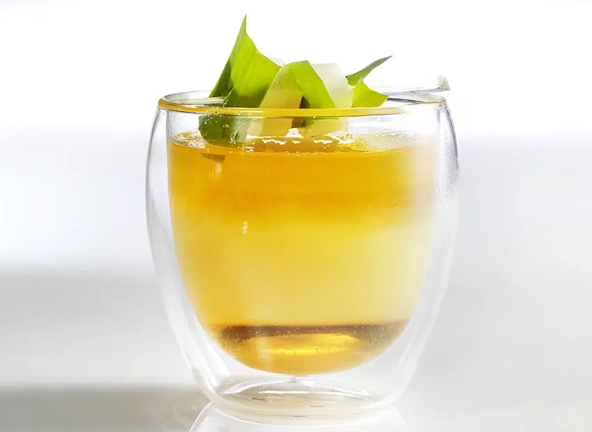 Dien op het laatste moment op, versierd met een spiesje met perenblokjes en wat groen (munt, limoenschil enz.)