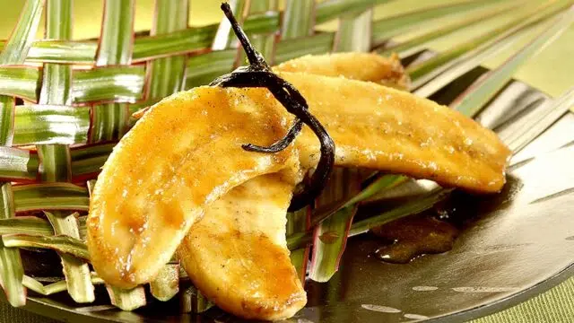 Deze gestoofde bananen zijn nog lekkerder met een bolletje ijs met vanille van Madagaskar van Adélie en geroosterde amandelschilfers.