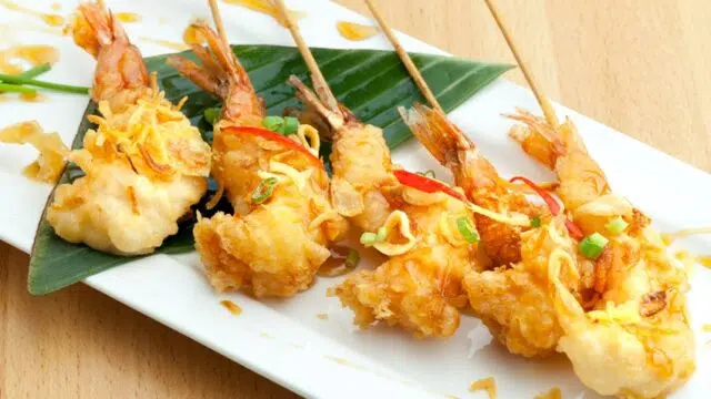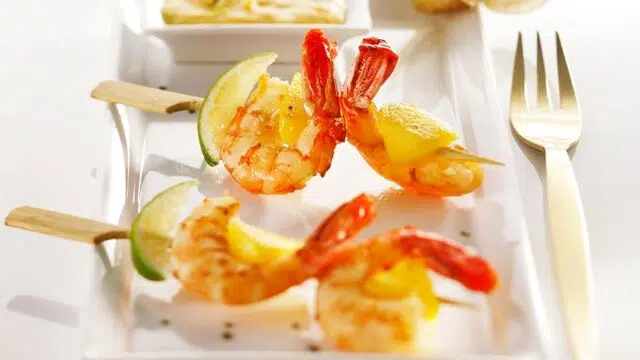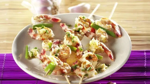 4. Gril gedurende 10 tot 12 minuten en draai de brochettes halverwege om.