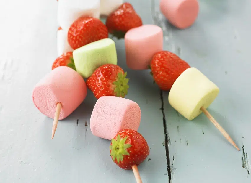 Prik afwisselend (gewassen) aardbeien en marshmallows op metalen of houten prikkers.