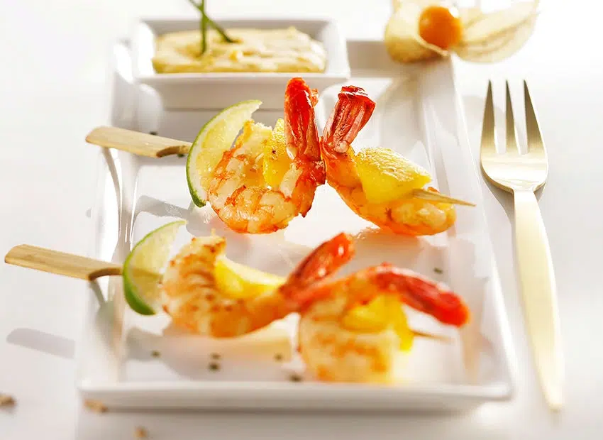 Prik de gamba’s en de stukken perzik op een houten prikker. Bestrooi met kerriepoeder en leg 2 min op de grill.