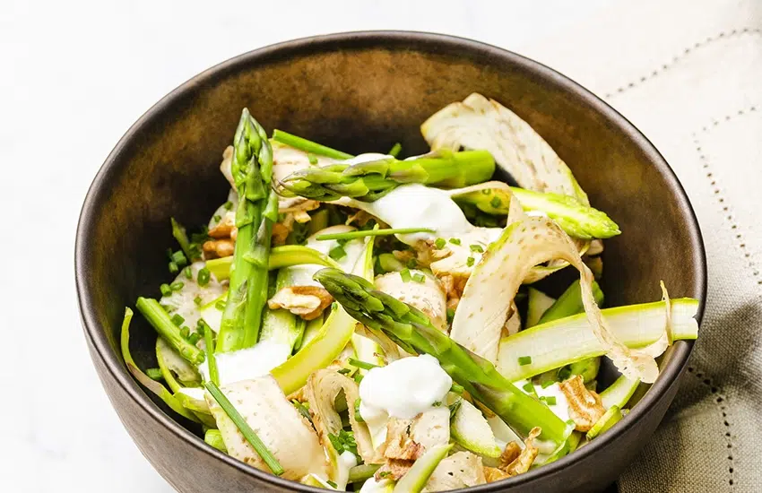 4. Voor de presentatie: meng de artisjok- en aspergesneden,leg er de aspergekoppen en enkele mespunten vinaigrette op.