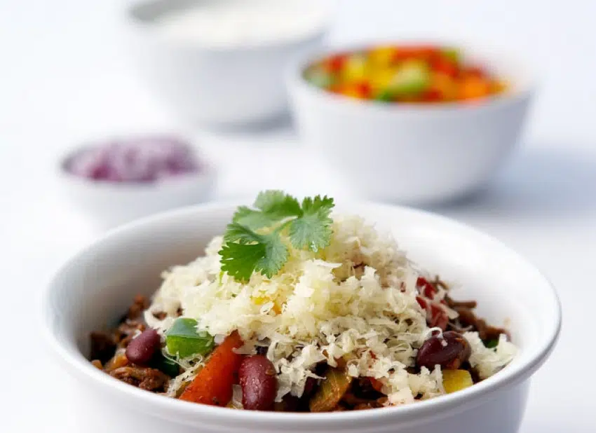 Verwarm 1 el olijfolie in een stoofpan met dikke bodem. Braad het gehakt gedurende ongeveer 4 minuten. Zet apart. Fruit de uien, de selderij, de wortels en het knoflook in de resterende olijfolie gedurende 3 minuten. Voeg het komijnzaad, de chilikruiden en de oregano toe. Zet het gehakt terug in de stoofpan. Voeg zout en peper toe.