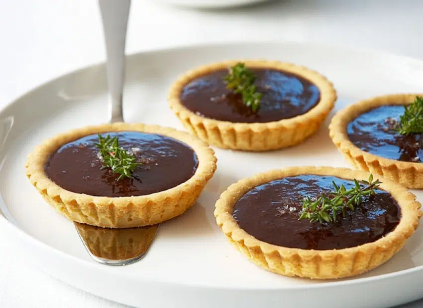 Bestrooi de taartjes zodra de ganache stijf is met fleur de sel. Garneer met takjes tijm.