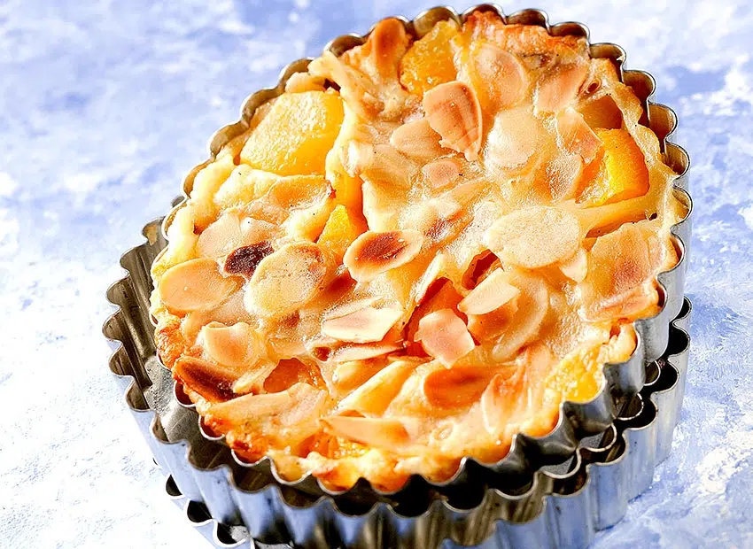 Vet individuele vormpjes in met boter. Verdeel er de uitgelekte perziken en de kort, droog geroosterde amandelschilfers over en vul met de bereiding.