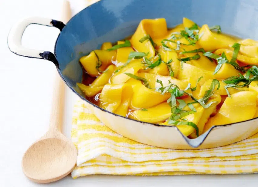 Info: Jamaicaanse peper is een scherpe soort piment. Deze specerij is een ‘all-round’ smaakmaker: zijn smaak combineert die van peper, nootmuskaat, kaneel en kruidnagel. Heb je geen Jamaicaanse peper in huis, gebruik dan nootmuskaat of kaneel. Compote van mango met basilicum.