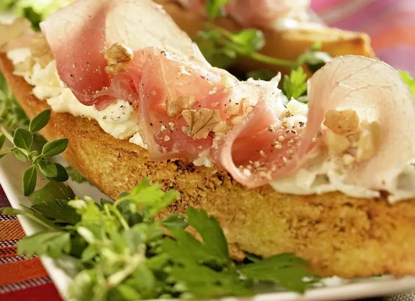 5. Besmeer elk sneetje lauw brood met mascarpone, verdeel er de lintjes ham over en voeg de noten toe.