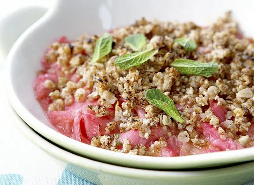 - Rabarbercompote1 kg rabarber schoongemaakt, in stukken 4 el rietsuiker Regain Bio 1 tl gemberpoeder Cigalou 2 el waterCrumble2 el bloem Chabrior 2 el bruine suiker 2 el amandelpoeder van Elodie 2 el havervlokken 1 el walnoten Elodie, fijngemalen 1 tl gemberpoeder Cigalou 2 el olijfolie van Bouton d'Or 1 mespunt zout Cigalou