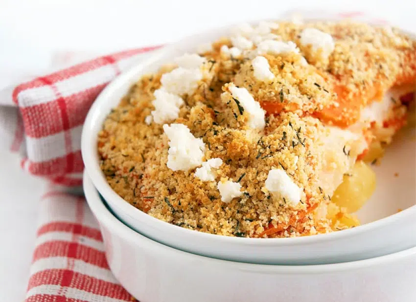 Crumble: Meng in een kom het paneermeel, de tijm, de olijfolie, zout en peper. Verdeel de crumble over de gratin. Gaar zonder aluminiumfolie gedurende 15 minuten. De crumble kleurt mooi goudbruin. Verdeel over de borden.