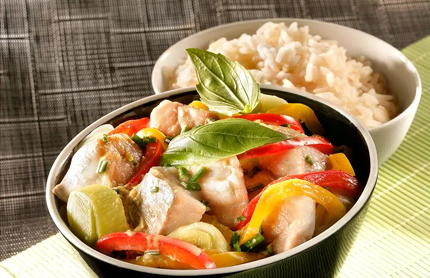 - 750g van koolvis terug1 rode peper, 1 gele peper3 witte preien2 teentjes knoflook8 blaadjes basilicum6 sprietjes bieslook75 cl kokosmelk Itinéraire des Saveurs