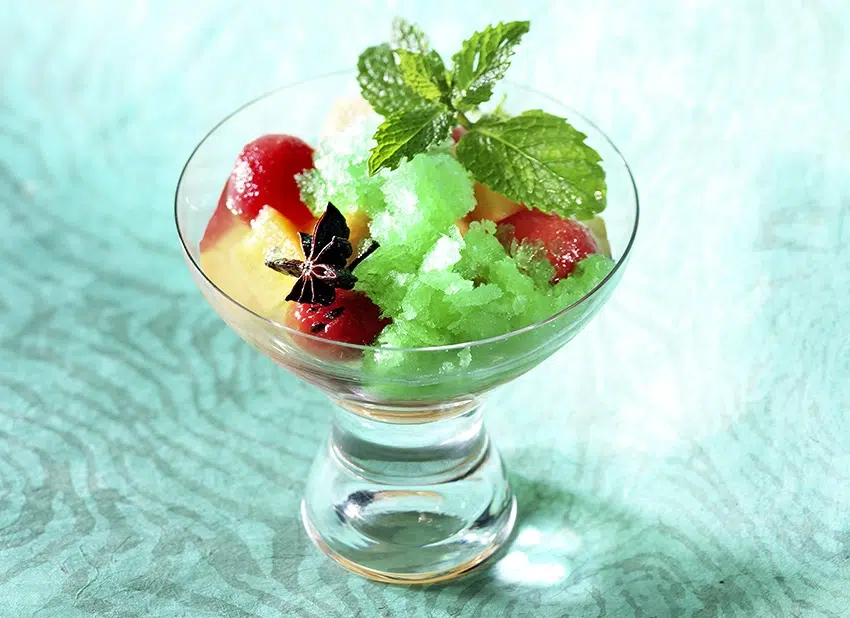 Laat de meloenblokjes uitlekken en verdeel ze over de coupes. Leg de bolletjes watermeloen erbij en voeg net voor het serveren de ijskoude muntgranité toe, samen met een muntblaadje en steranijs ter versiering.