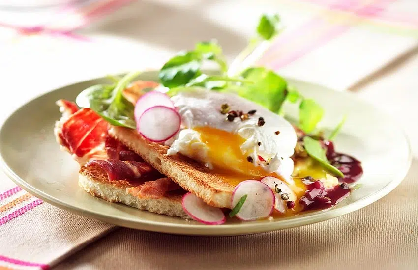 Stapel het toastbrood, de ham en het gepocheerde ei op een bord. Besprenkel met saus, kruid met verse peper van de molen en dien op. Geef er enkele blaadjes sla, schijfjes radijs en fijngehakte lente-uitjes bij.