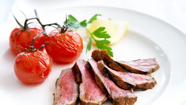 Om de runderribstukjes te bakken, zout en olie beide kanten van het vlees. Bak het vlees 7 minuten aan elke kant op de grill en laat het 10 minuten rusten voordat u het in plakjes snijdt. Voeg na het snijden de gehakte peterselie toe aan het vlees.