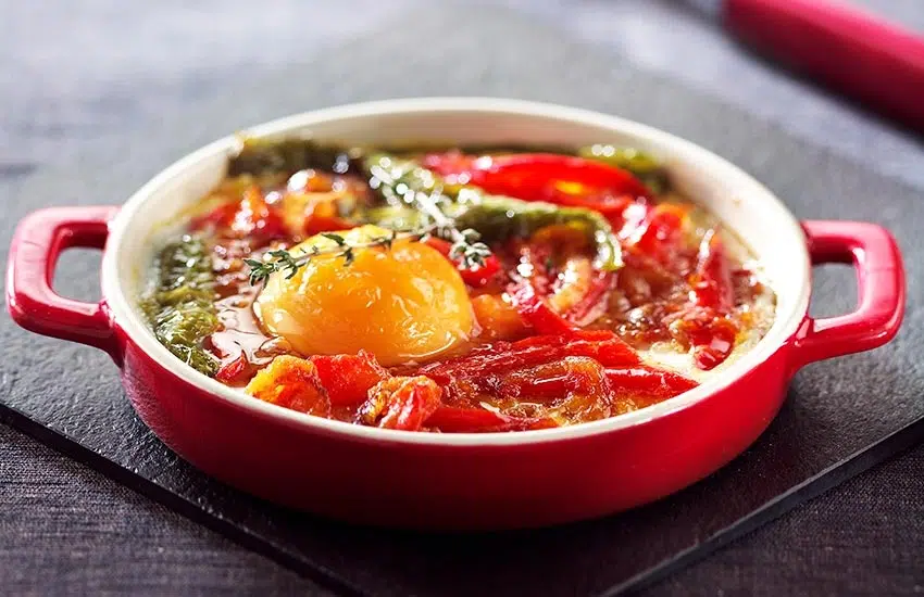Verdeel over 4 individuele ovenschoteltjes en breek er dan een ei in. Kruid met peper en zout en schuif voor 5 minuten in de oven. Dien warm op.