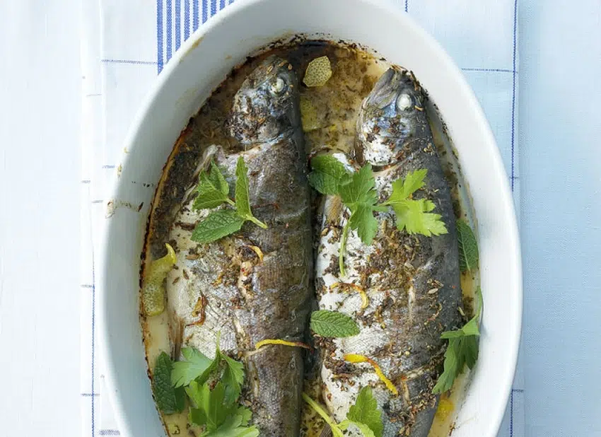 Verwarm de oven voor op 220 °C. Maak een of meerdere ruitvormige inkepingen in de huid aan beide kanten van de forellen. Plaats de vissen in de marinade. Verdeel de citroenrasp over de vissen. Zet koel gedurende 1 uur. Bak de forellen gedurende 20 minuten in de oven.