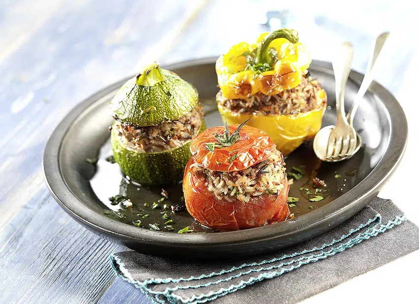 Vul de groenten met dit mengsel en zet de hoedjes er opnieuw op. Schik ze in een ovenschotel, dicht tegen elkaar. Giet de bouillon erbij, samen met de rest van de olie en de wijn.