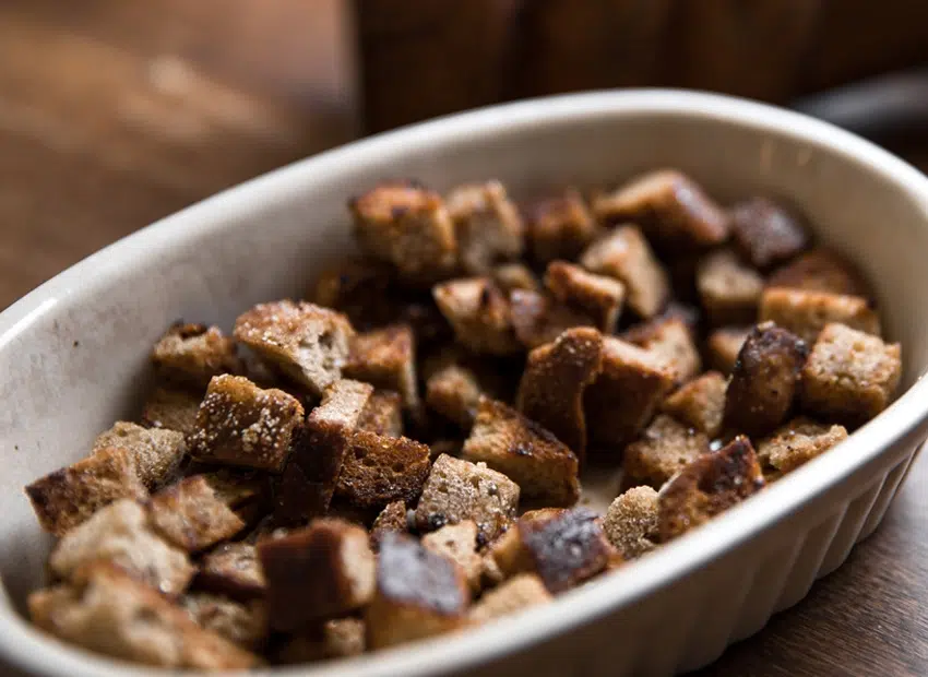 In een lichte en evenwichtige maaltijd zorgen deze croutons zonder vetstof voor een knapperige touch in groentesoep.