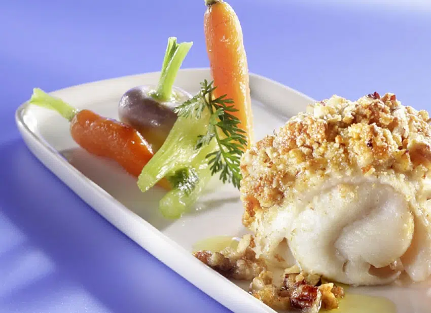 Rol de heilbotfilets op en steek ze desgewenst vast met een houten stokje. Bedek ze met een dikke laag notenmengsel. Druk dit met een vork aan om het aan de vis te laten kleven.