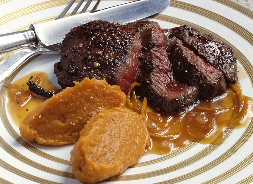 Voor een mooi, monochroom effect kun je bij dit hindegebraad een puree van pompoen of zoete aardappelen serveren.