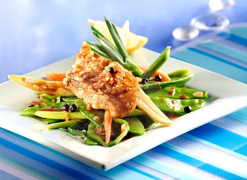 Kruid bij en serveer de vis met de groenten, besprenkeld met saus.