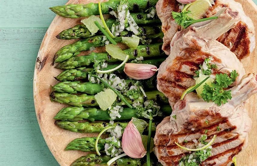 Hier is een recept van kalfskotelet met groene asperges en mosterdvinaigrette, een bereiding die de malsheid van het kalfsvlees en de versheid van de asperges benadrukt. Eet smakelijk!