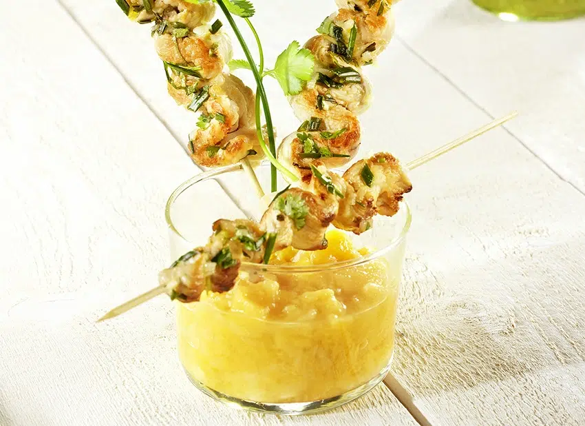 Prik de kalkoenlintjes op houten prikkers, leg ze op een bakplaat en bak onder de grill gedurende 6 à 7 minuten.