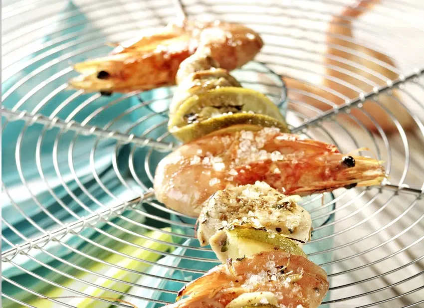 4. Wissel op grote houten brochettes de scampi’s, de lintjes kip en de halve schijven limoen af.
