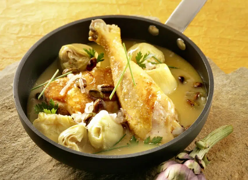 Spoel de artisjokken af onder lauw water en laat ze uitlekken. Snijd de kippenbillen in 2 ter hoogte van het gewricht.