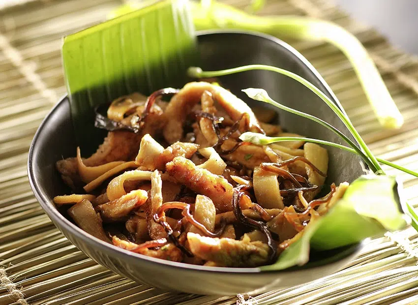 Verhit 2 el olie in een wok, bak de kip 7 à 8 min., doe er de bamboe, paddenstoelen en marinade bij en bak nog 6 à 7 min.