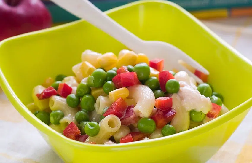 Doe de koude pasta in een slakom, samen met de tomatenblokjes, maïs en erwtjes