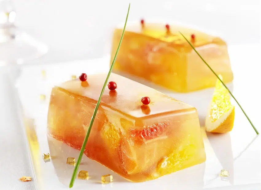 7. Doe er de in stukken gesneden zalm bij, gevolgd door de partjes citrusfruit, overgiet met de rest van de gelei en plaats weer 3 uur in de koelkast.