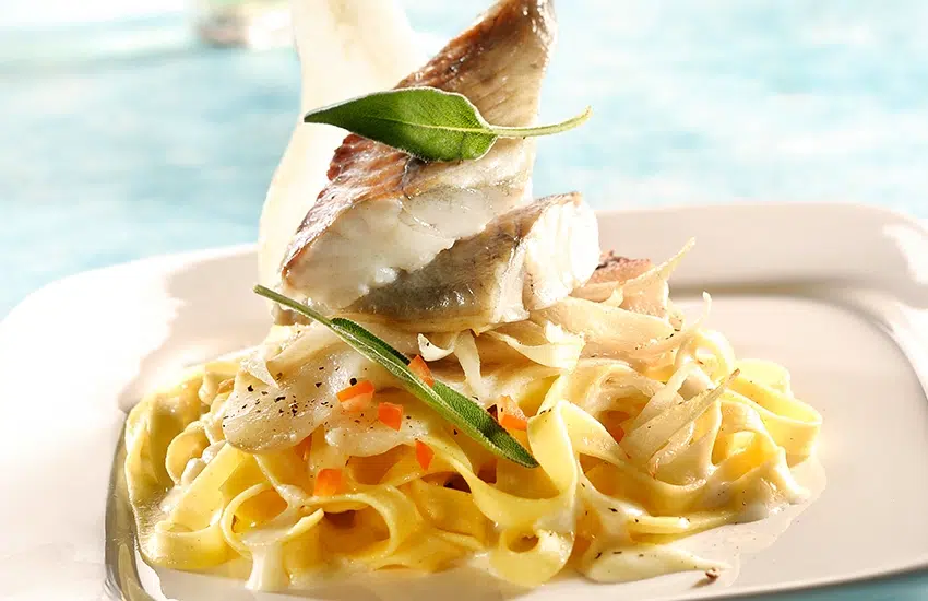 Koolvis en tagliatelle met geitenkaassaus