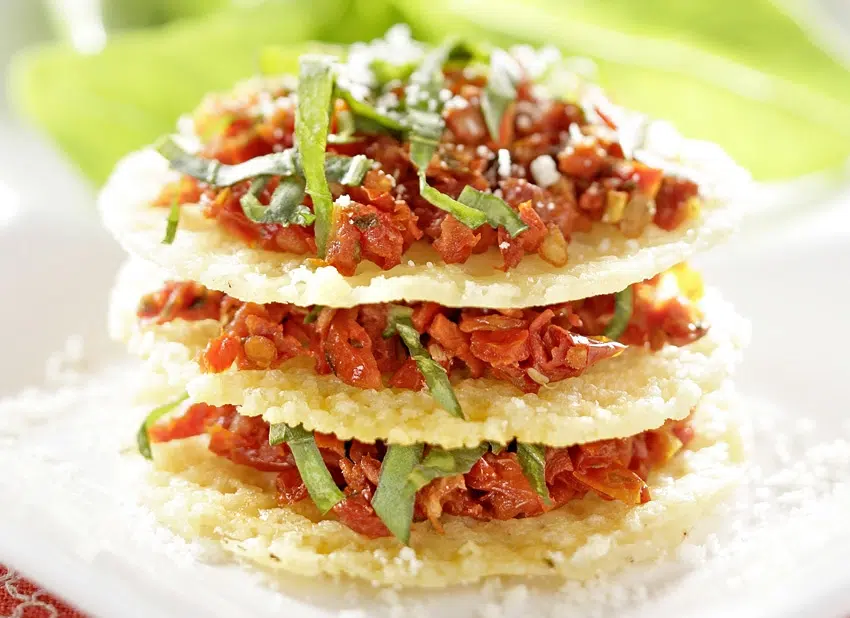Krokantjes van Parmezaanse kaas en gedroogde tomaten