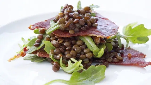 Maak mayonaise met de eidooiers, een beetje zout en neutrale olie. Doe er nu de resterende spekblokjes bij.