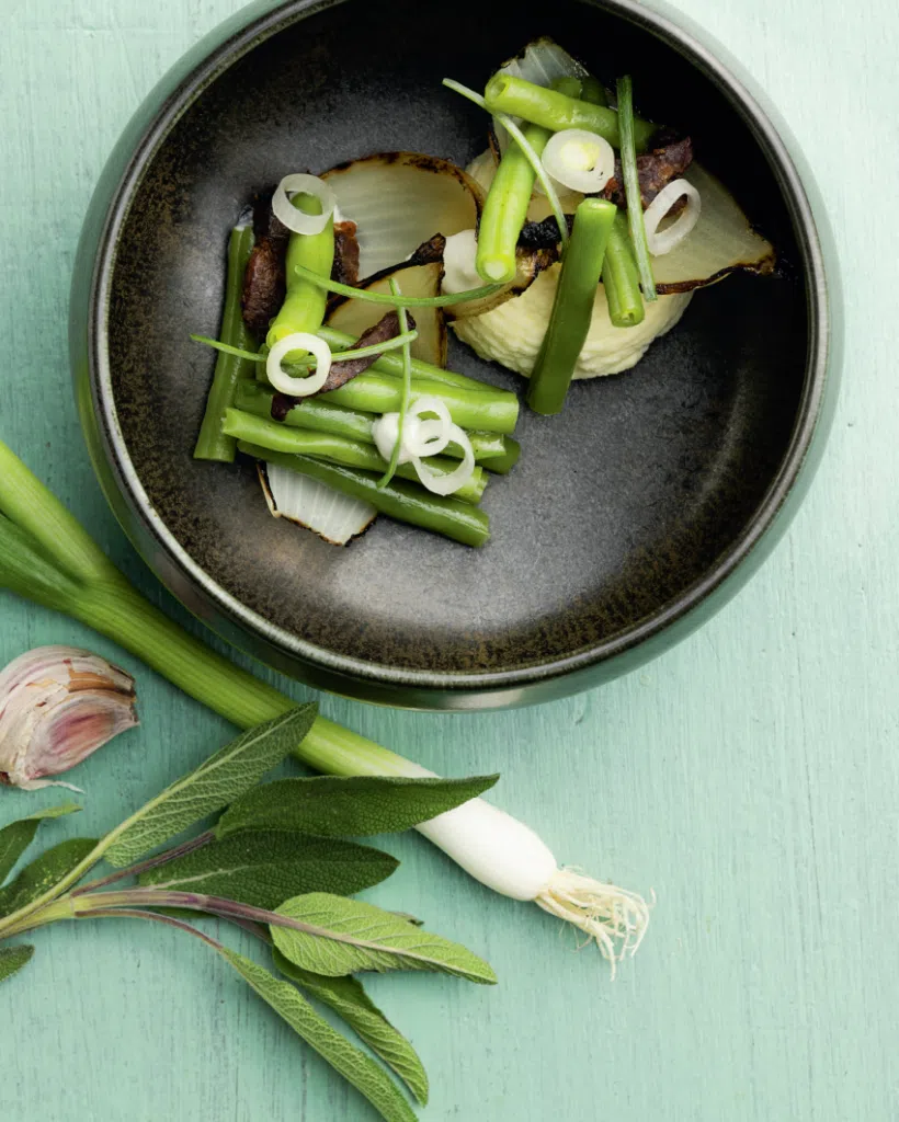 Zo stopt het koken. Bak de gehakte sjalot goudgeel in wat olie en doe er de gekookte sperziebonen bij, om ze te laten glanzen.