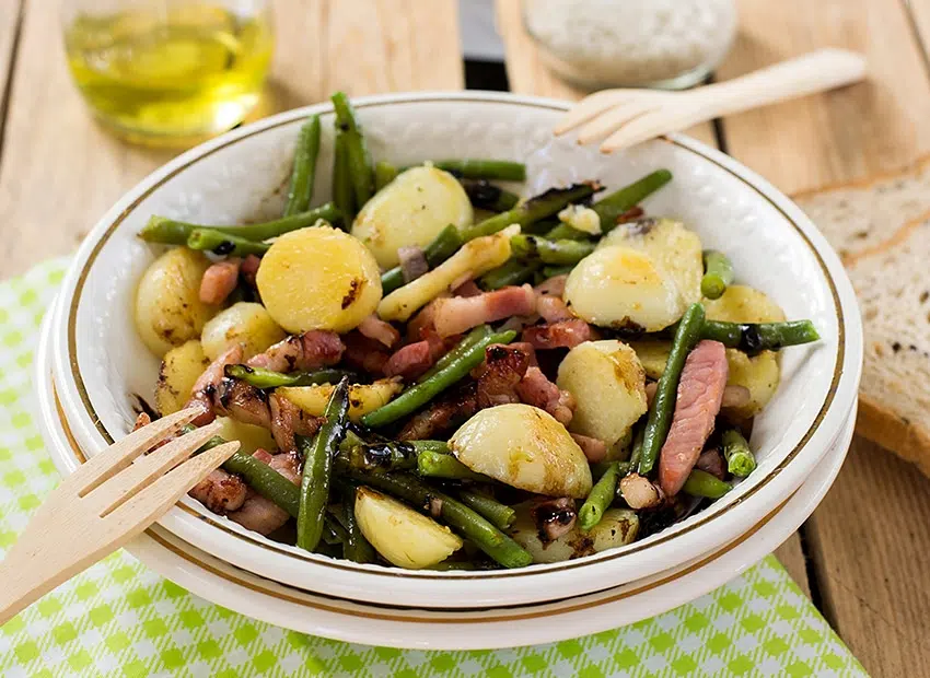 Doe de aardappelen, de bonen, de spekblokjes en de uien in een kom.