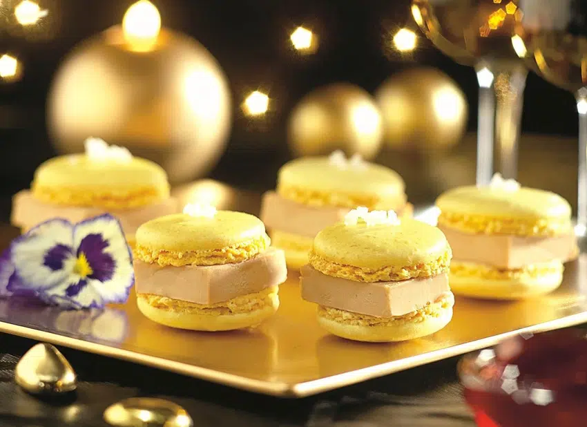 10. Snijd de foie gras in schijfjes en plaats een schijfje tussen twee koekjes.