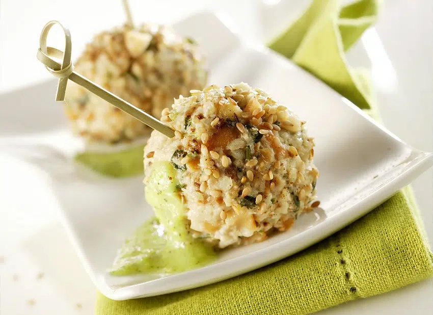 Rol balletjes van het mengsel. Druk ze goed aan zodat ze stevig blijven. Rol ze in de sesamzaadjes.