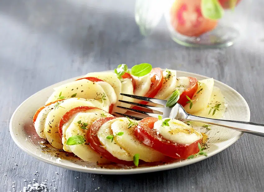 Snijd de gewassen tomaten en mozzarella in plakken.