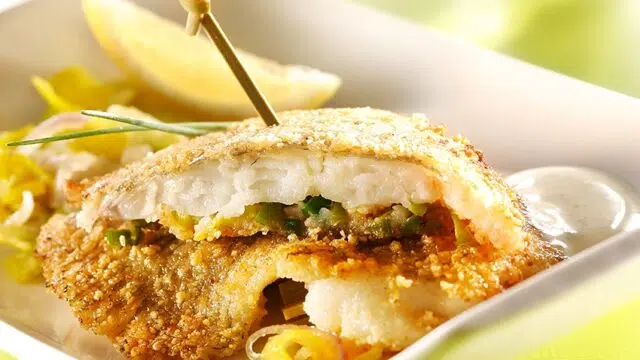 Gepaneerde scholfilets met prei