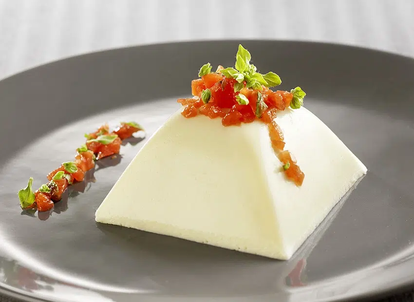 Panna cotta met asperges en tomaten met basilicum