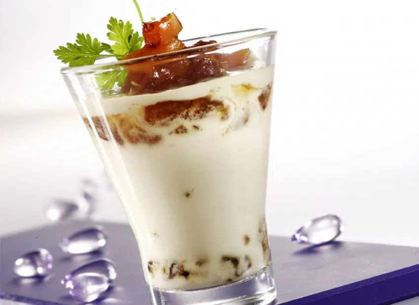 Panna cotta met foie gras Bereid de panna cotta door de gelatinevellen te weken in koud water. Mix de foie gras, voeg het mengsel van room en warme melk toe, de uitgeknepen gelatine en kruid met peper en zout.