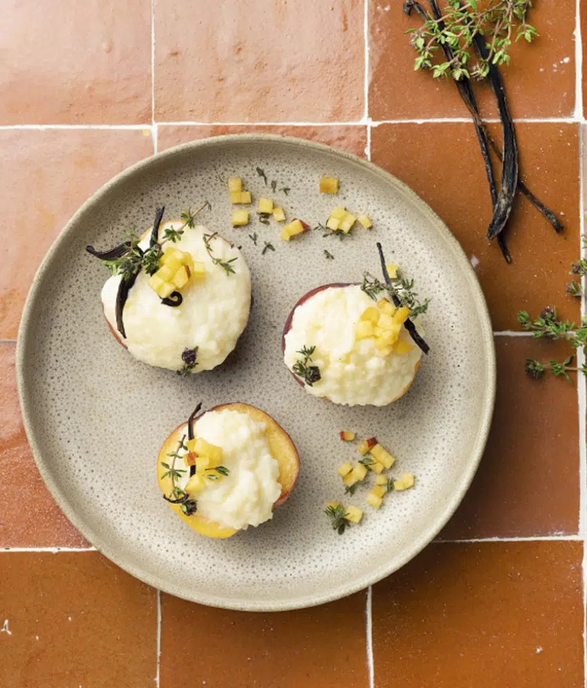 Leg 4 gehalveerde perziken in een ovenschotel. Bestrooi de perziken met rietsuiker en tijmblaadjes. Bak 5 minuten op 180°.