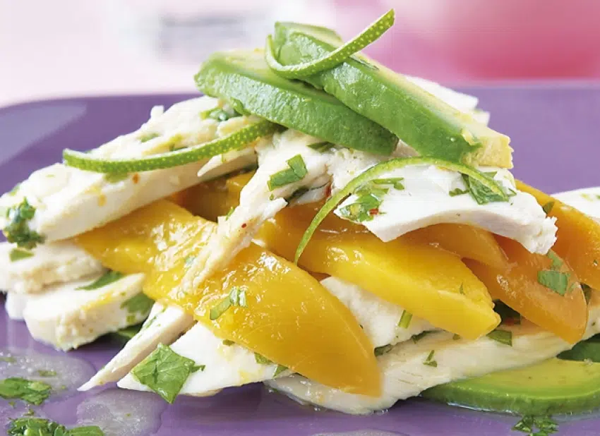 3. Schik de plakjes kip, mango en avocado in lagen op elkaar. Bestrooi met fijngehakte koriander. Serveer met de resterende vinaigrette.