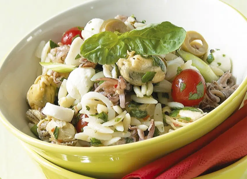 Vinaigrette: Meng in een kom de ciderazijn, zout en peper.Voeg de olijfolie toe.Roer in een slakom de vinaigrette door de pasta. Voeg de jonge uien, het basilicum en de peterselie toe. Roer goed. Voeg de zeevruchtencocktail, de mosselen, de mozzarella, de olijven en de kerstomaatjes toe. Roer goed.